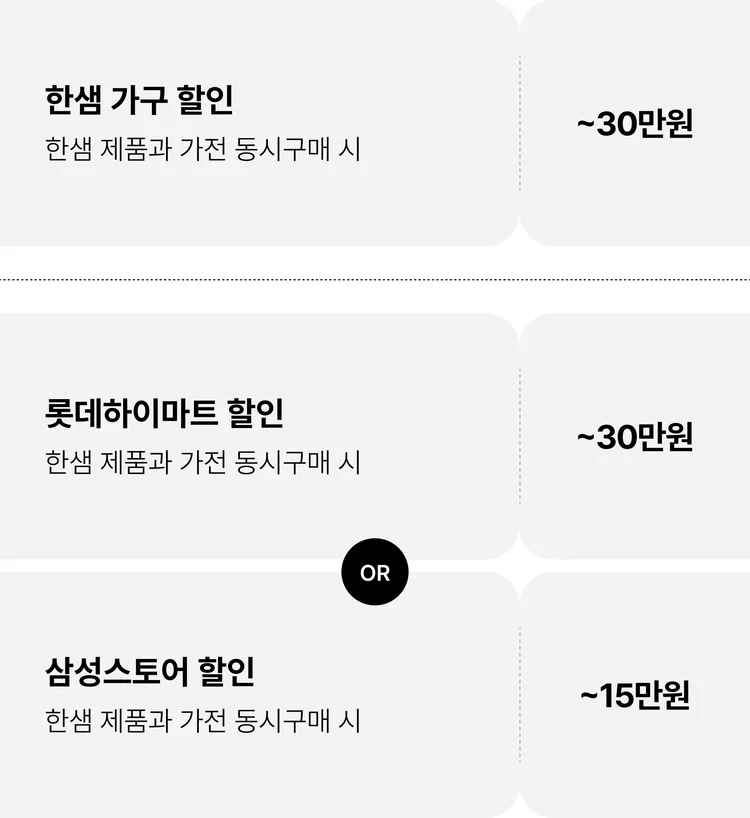 • 가구 첫 구매일 기준으로 31일 이내 가전 구매 시 이벤트 적용이 가능합니다. (가구↔가전 구매순서는 무관)